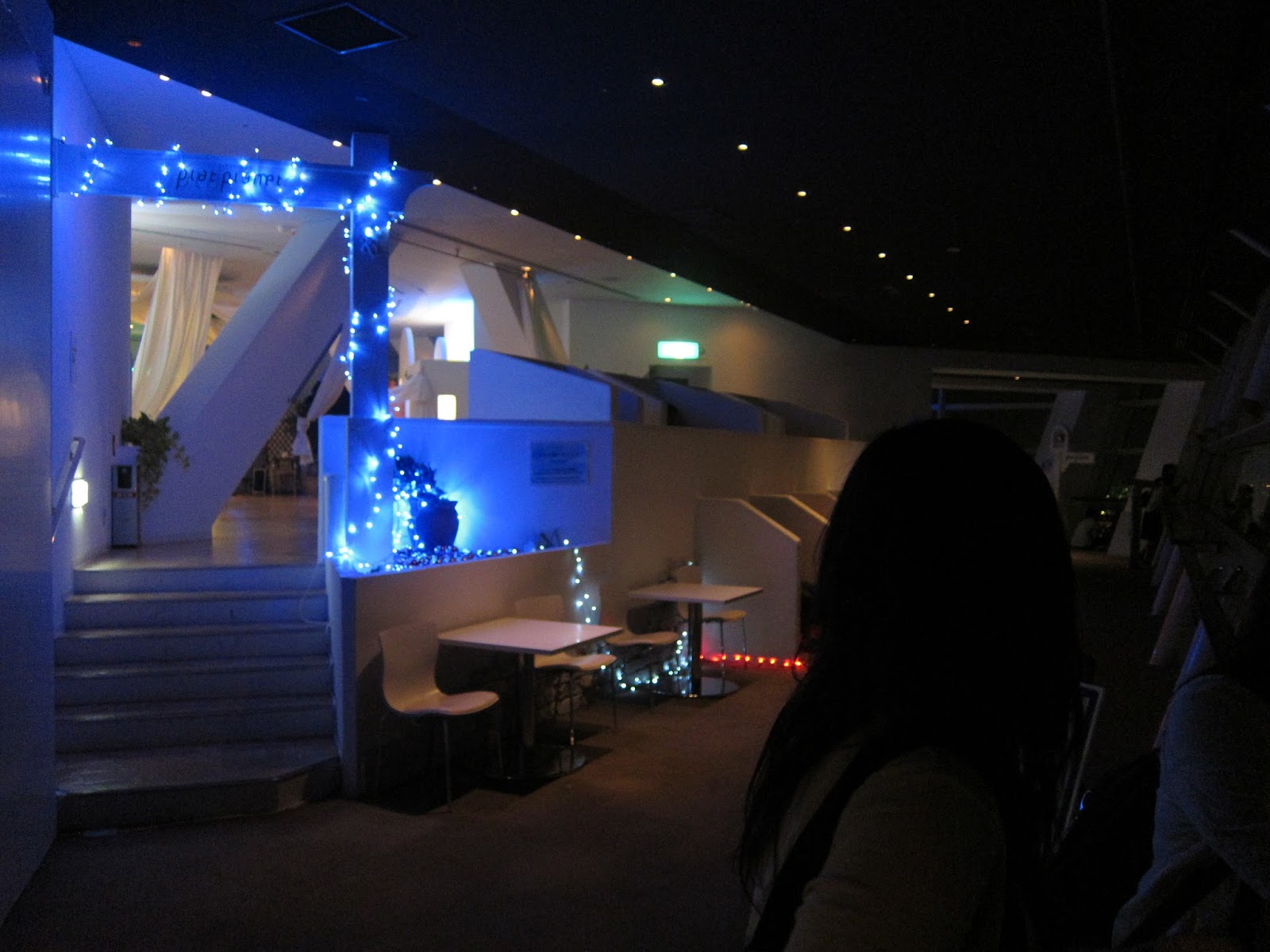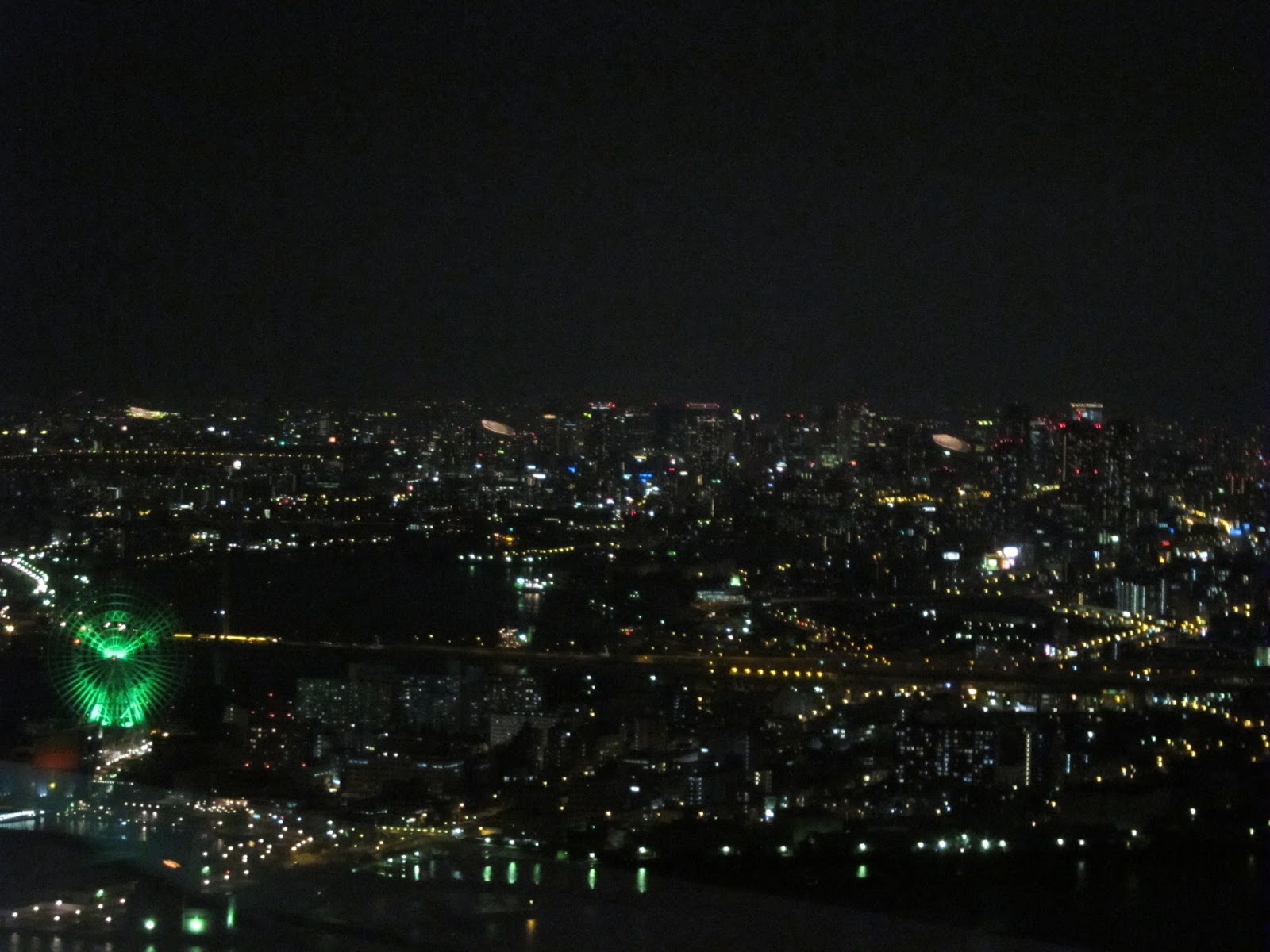 我們來到展望台的第一件事並不是看風景,而是立刻找吃的,這兒有一所情調不錯的餐廳,吃的是輕食類型的,我們只買了蛋糕和果汁,留待回到難波才吃正餐,但餐廳的情調實在太好了,環境太暗害我有點想睡呢!大阪的高樓不多,所以在55樓的景觀是一級棒的!加上這個360度的展望台,繞著展望台一圈欣賞大阪的夜景就更覺美景璀璨了!