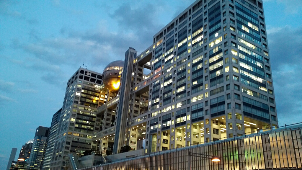 在Decks玩了一個下午,已經開始到黃昏了,我們便沿路折返回到Diver City。這才看到已亮燈的電視台多麼美呢!