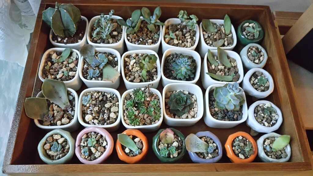 其實最主要是地方有限,只能限制所有小盆全放在這個大木盆中,買的時候已計算清楚尺寸,盆就只有這麼多了,之後就是努力地把肉肉們全擠進這個空間,這難免有分租的情況了。