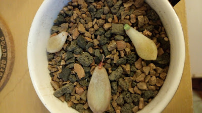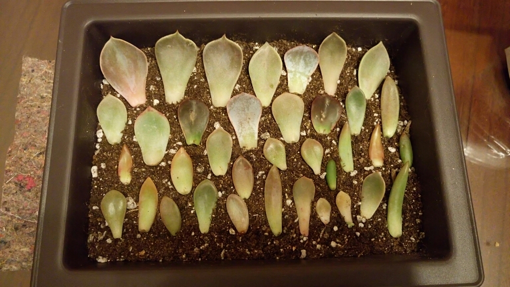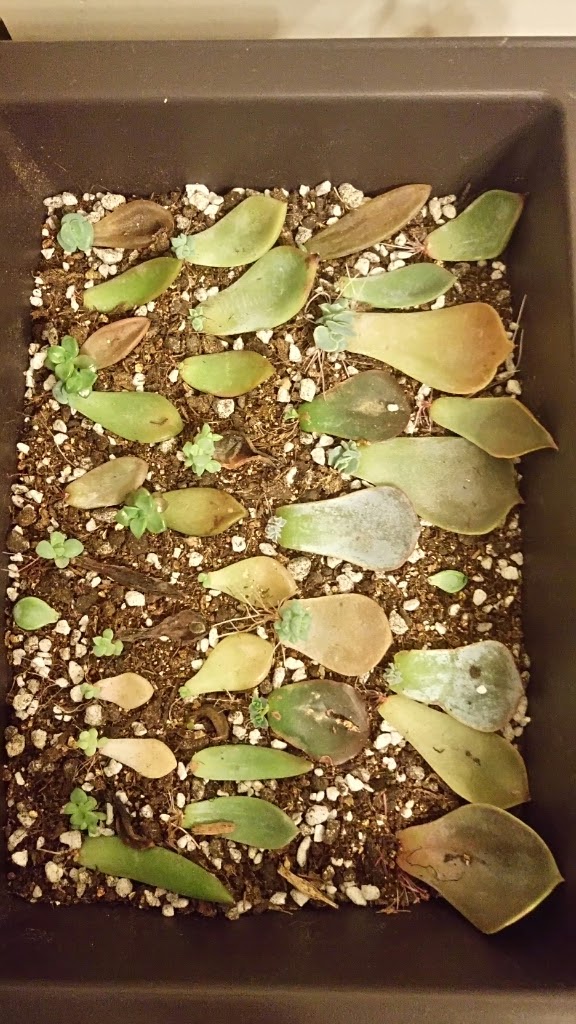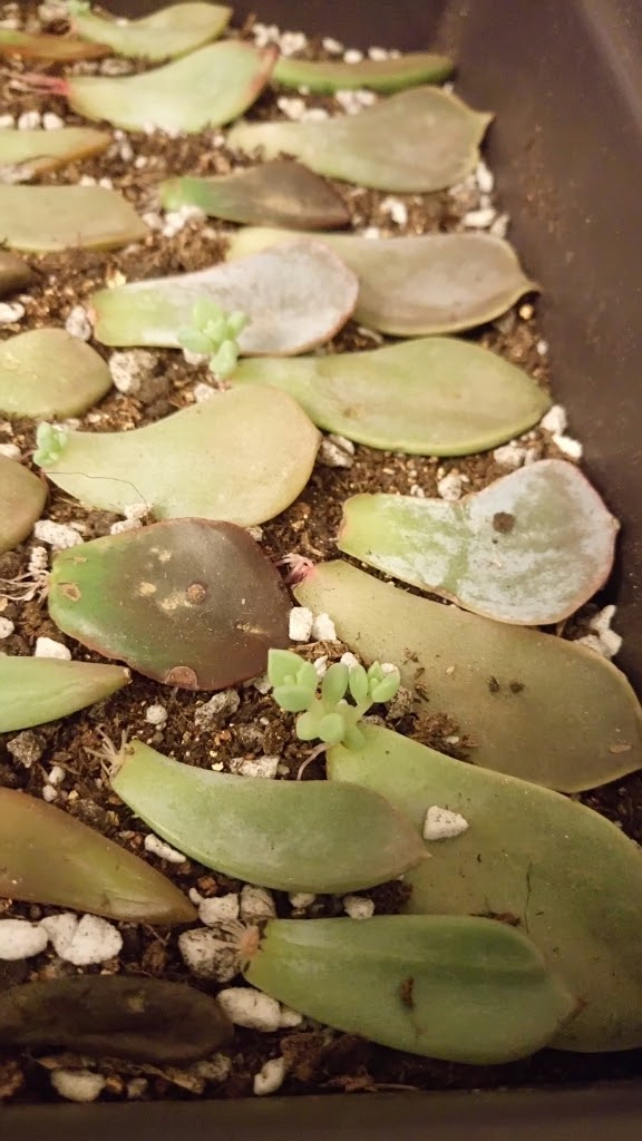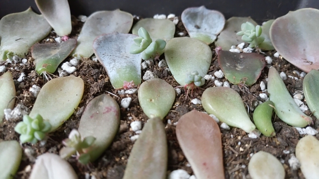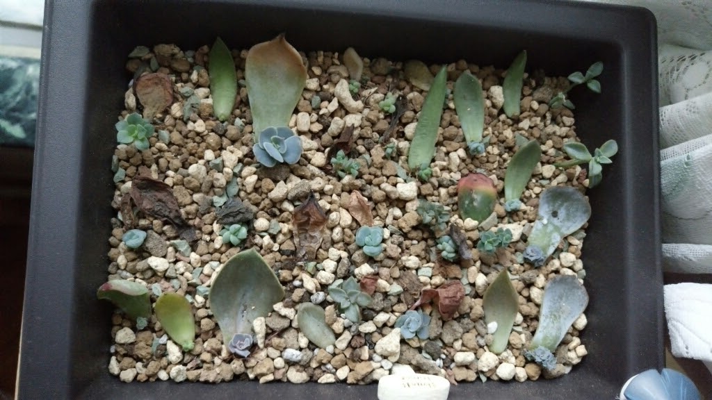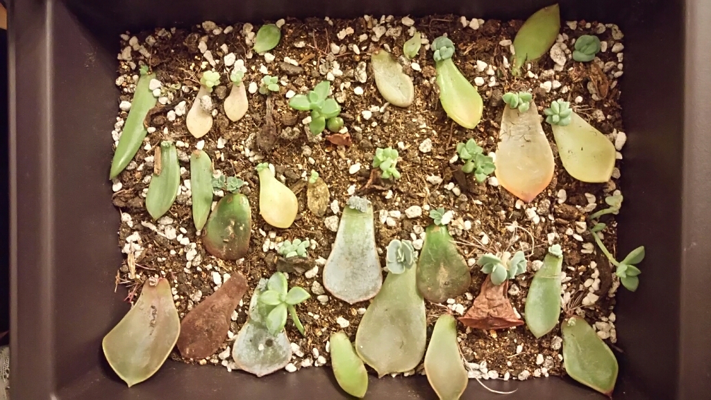 我告訴自己,三片的葉插全部看得到成果,即是100%的成功了,總比看到多肉掛掉好得多,是成功是開始呢!於是逛網店搜一下多肉葉片看看,竟然讓我發現其中一家在賣「葉片福袋」,就是一大堆葉片隨機貨色,由於只是葉片,價格比整顆肉來得合宜很多,於是二話不說便連盤連土拍下了,如是者,多肉版圖繼續擴大中~~