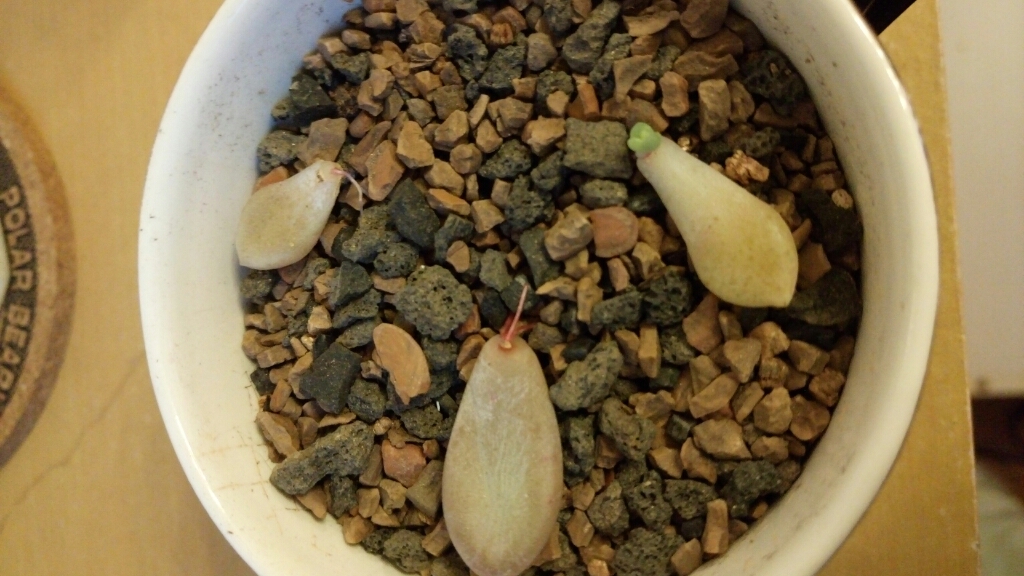 由於買了山地玫瑰的店舖突然送了我三塊葉片,店主說放在泥上甚麼也不用做就會生出子子孫孫了,一頭霧水之下照著做,放著不管一個月之後竟然長出根來了!就是因為這三片葉,讓我認識了這個叫做多肉葉插的繁殖方法。
